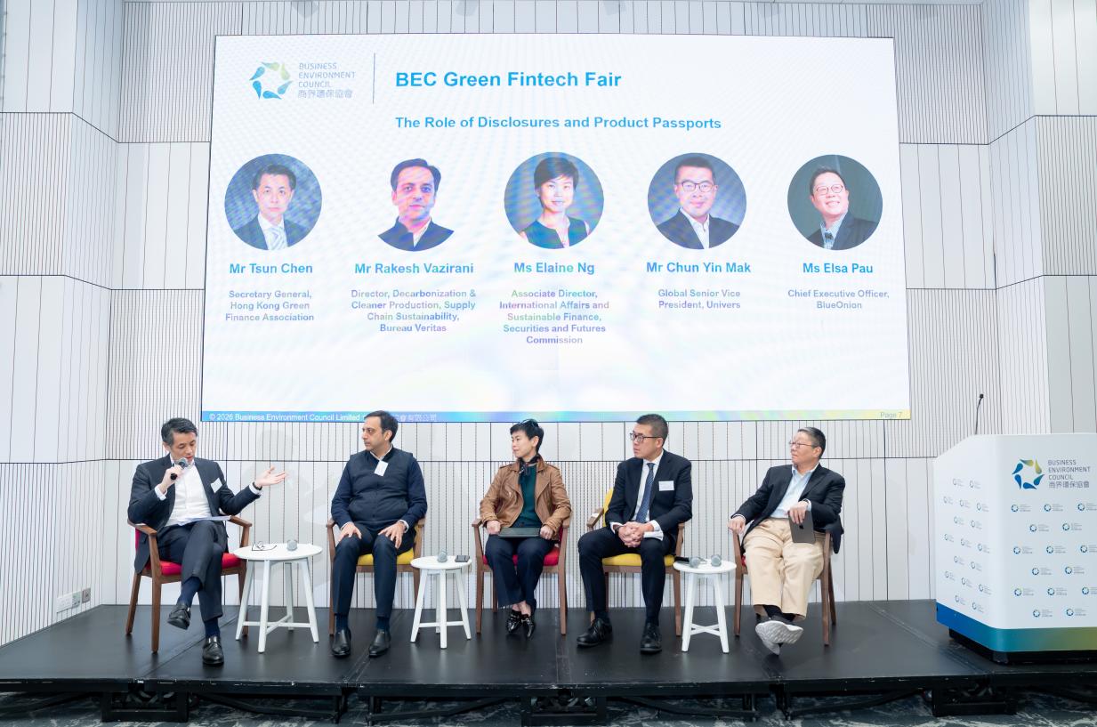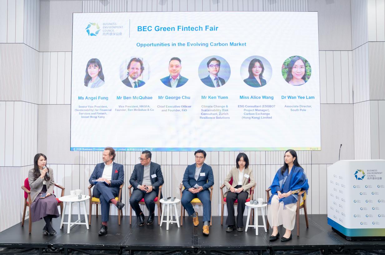 BEC Green Fintech Fair, organised by Business Environment Council (“BEC”) and sponsored by Invest Hong Kong, was held on 8 January 2026 (Thursday). In collaboration with strategic partners Hong Kong Green Finance Association and Civic Exchange, the event aimed to drive innovation and sustainability within the financial technology sector, foster dialogue and collaboration among stakeholders, showcase cutting-edge solutions in the industry that support the achievement of Hong Kong’s carbon neutrality goal, and offer business-matching opportunities for solutions providers and adopters.