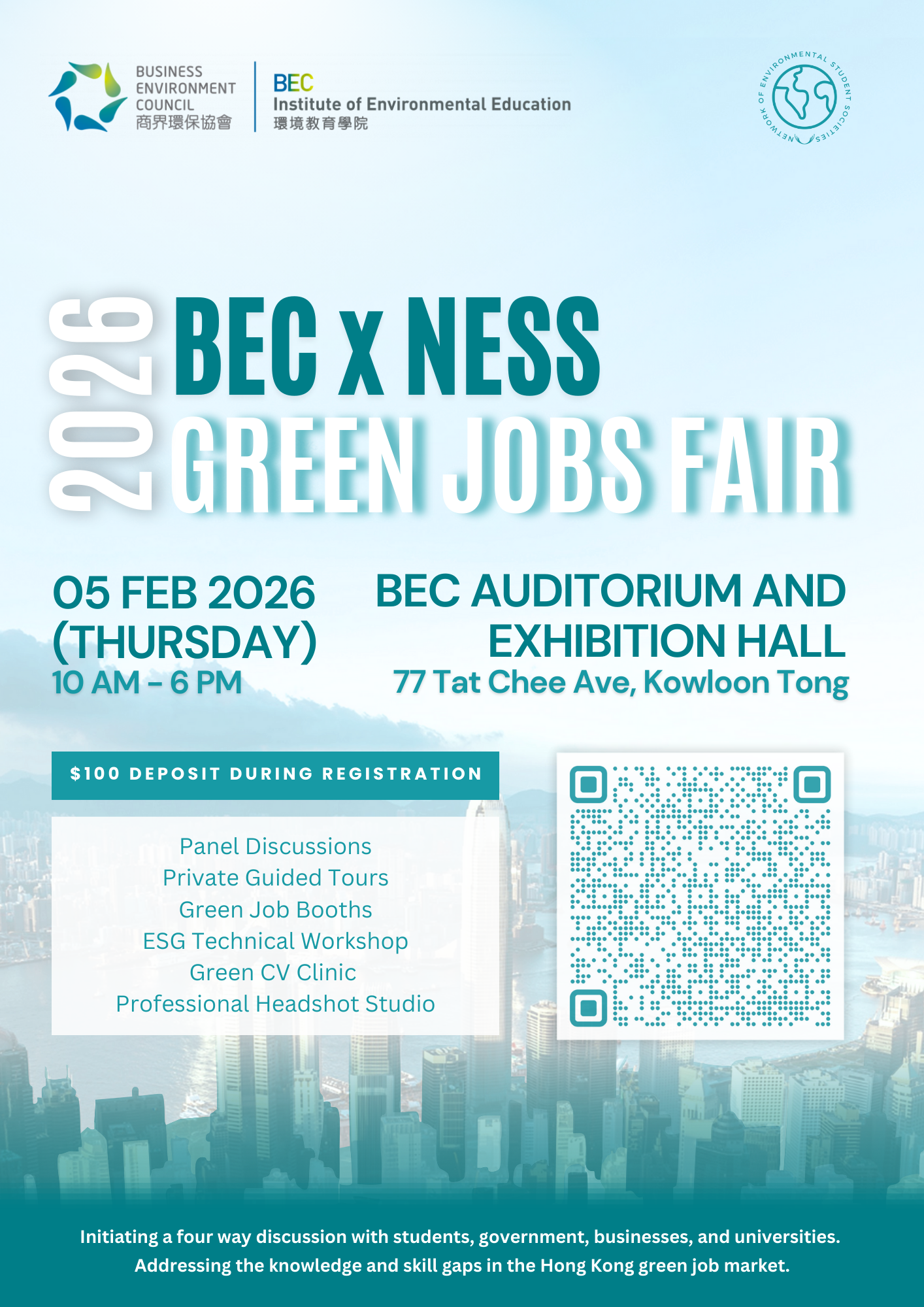 BEC x NESS Green Jobs Fair 2026 brought together companies, universities, students, and government officials for a comprehensive discussion aimed at addressing the current knowledge and skill gap in the Hong Kong green jobs market. Filled with panel discussions, technical workshops, green job booths, and multi-stakeholder dialogue, the one-day event connects youth with potential employers for prospective green jobs and sustainability programmes, and to gain insights on the required skill set and knowledge to enter the green jobs market.