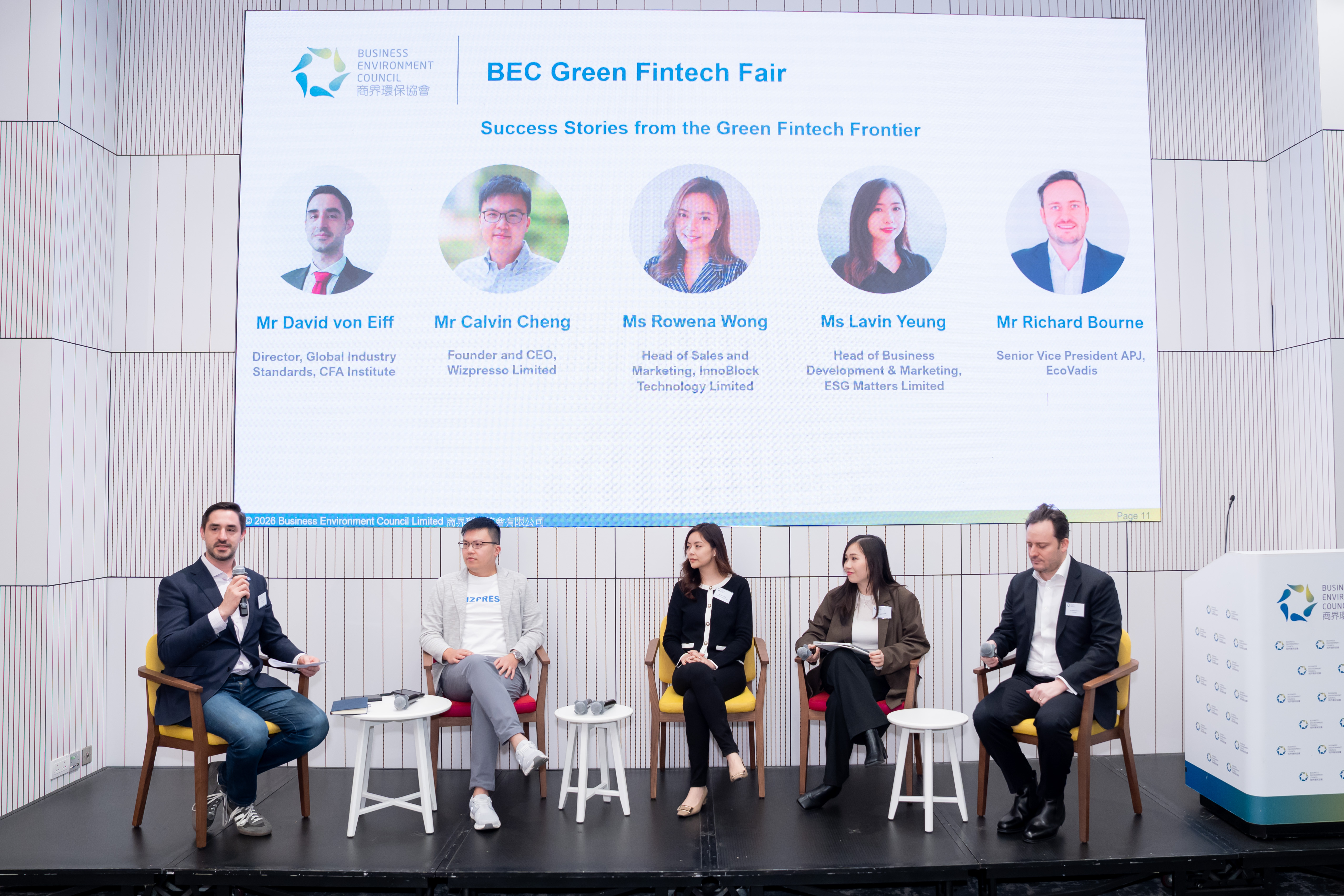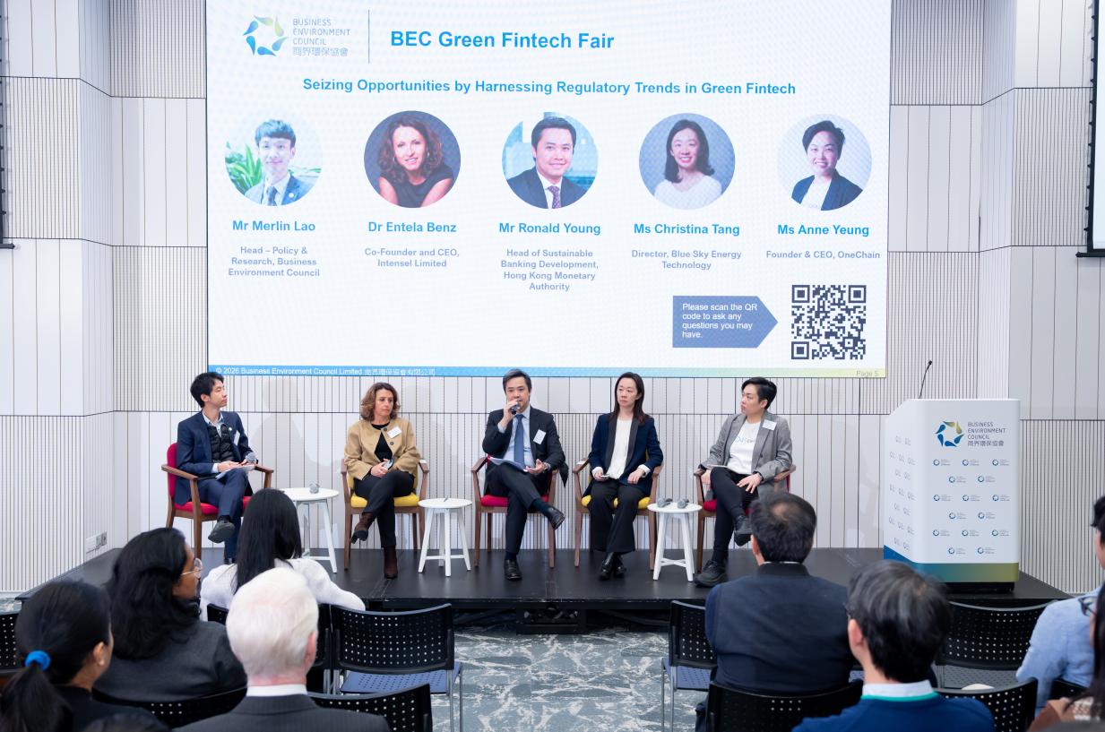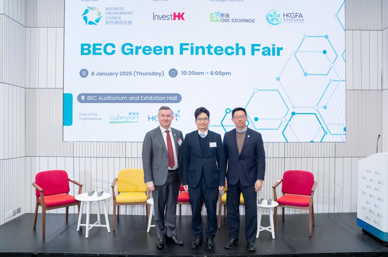 BEC Green Fintech Fair, organised by Business Environment Council (“BEC”) and sponsored by Invest Hong Kong, was held on 8 January 2026 (Thursday). In collaboration with strategic partners Hong Kong Green Finance Association and Civic Exchange, the event aimed to drive innovation and sustainability within the financial technology sector, foster dialogue and collaboration among stakeholders, showcase cutting-edge solutions in the industry that support the achievement of Hong Kong’s carbon neutrality goal, and offer business-matching opportunities for solutions providers and adopters.