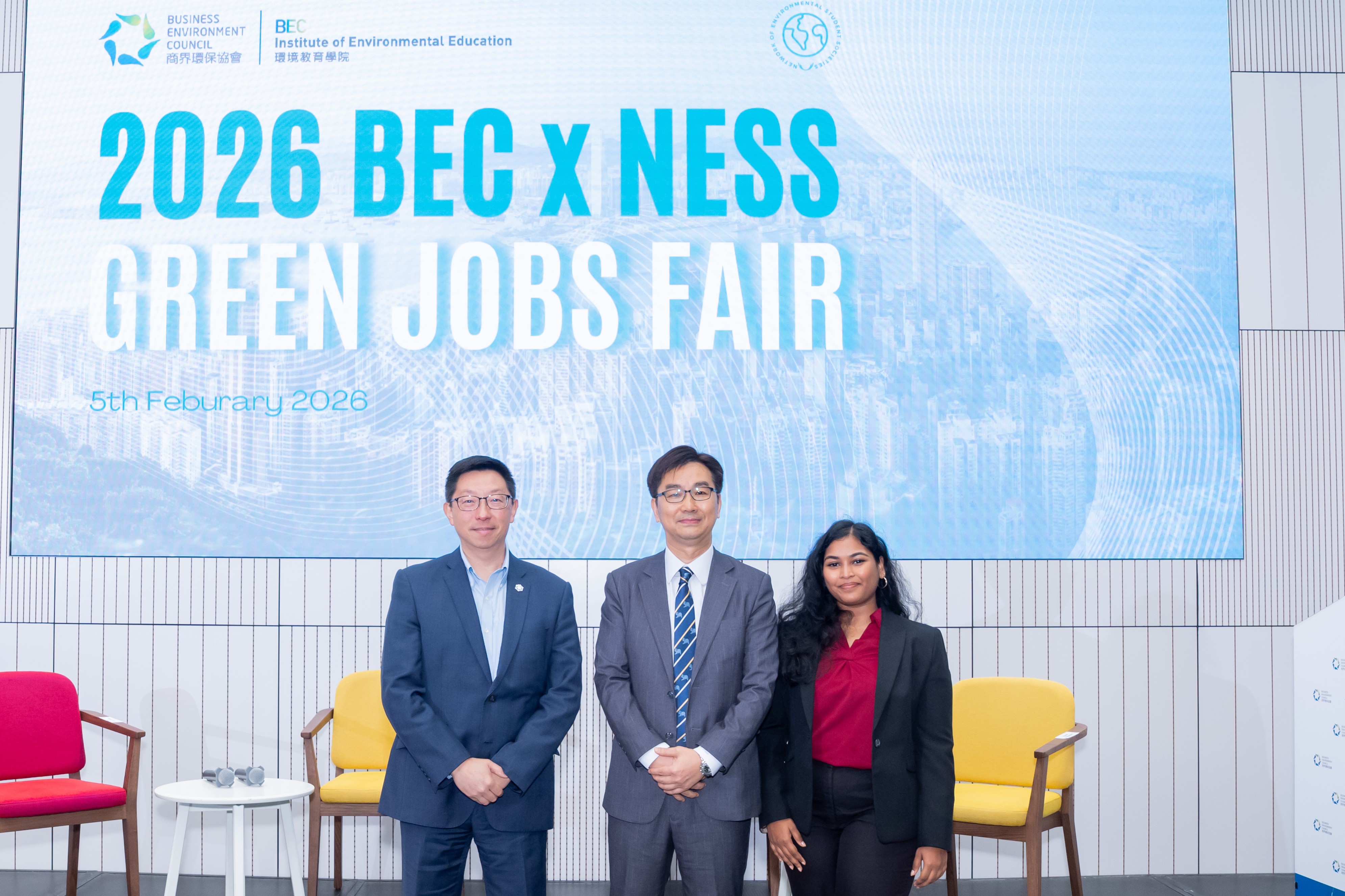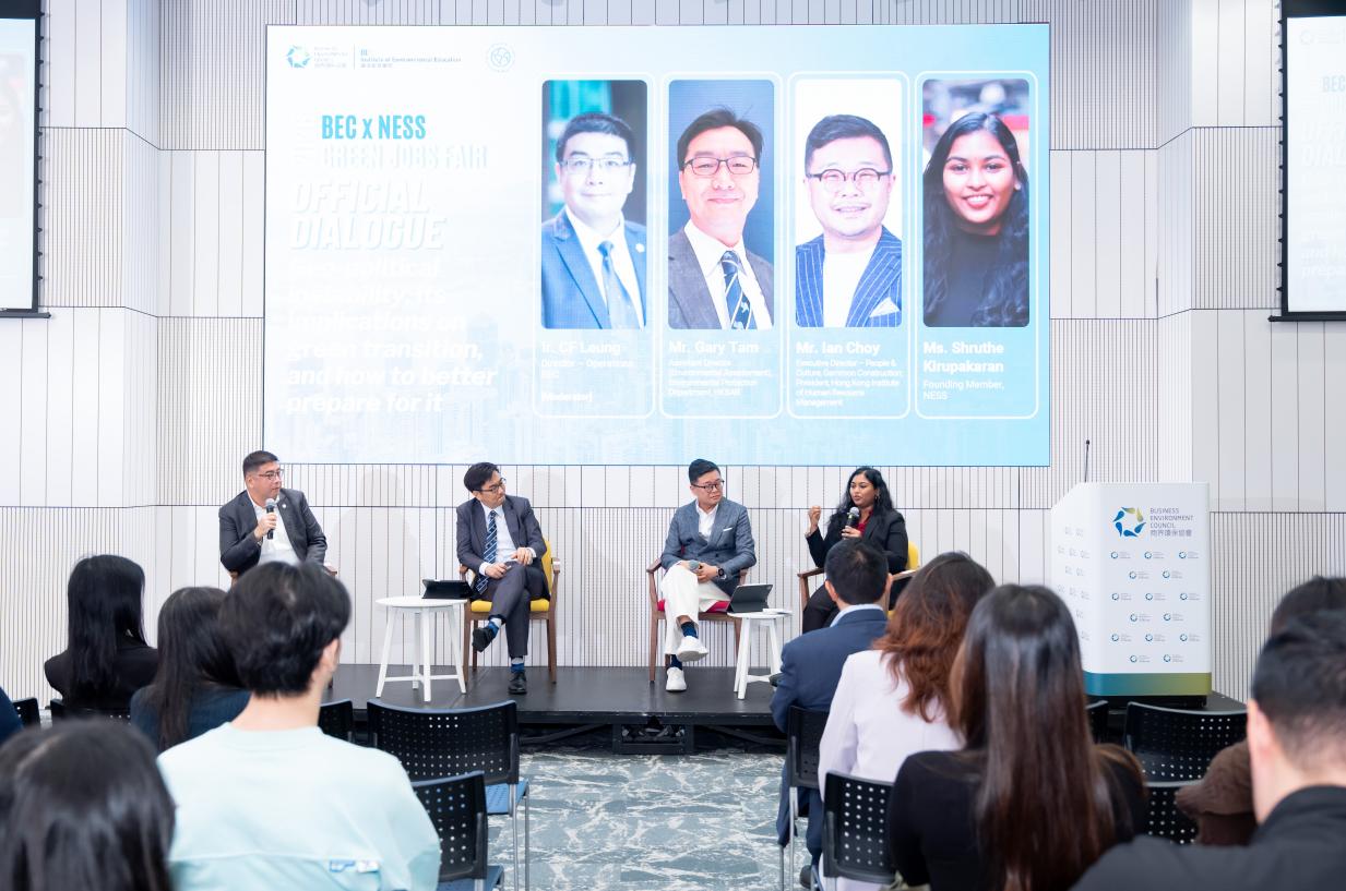 BEC x NESS Green Jobs Fair 2026 brought together companies, universities, students, and government officials for a comprehensive discussion aimed at addressing the current knowledge and skill gap in the Hong Kong green jobs market. Filled with panel discussions, technical workshops, green job booths, and multi-stakeholder dialogue, the one-day event connects youth with potential employers for prospective green jobs and sustainability programmes, and to gain insights on the required skill set and knowledge to enter the green jobs market.