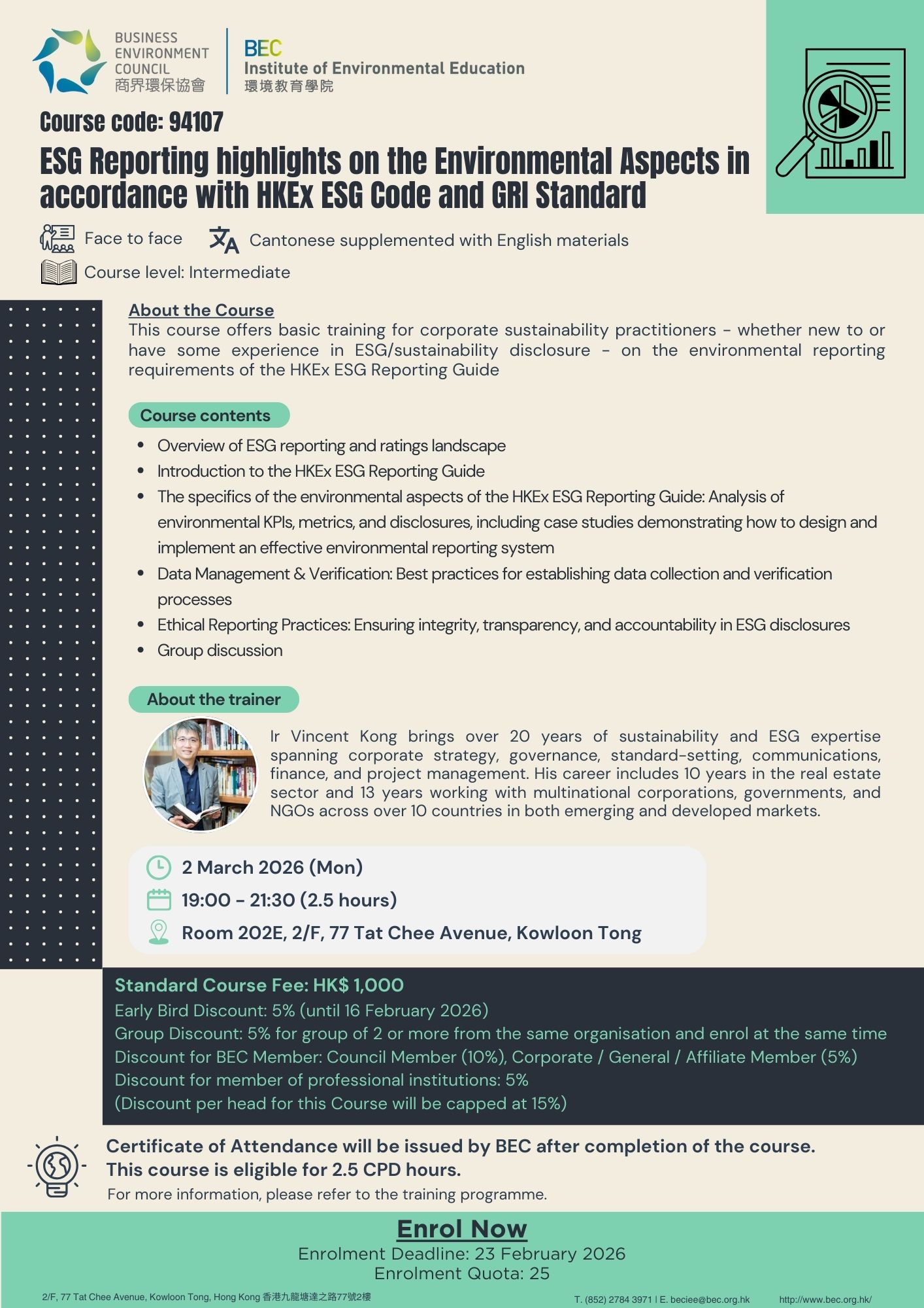 ESG Reporting highlights on the Environmental Aspects in accordance with HKEx ESG Code and GRI Standard (Course Code: 94107)