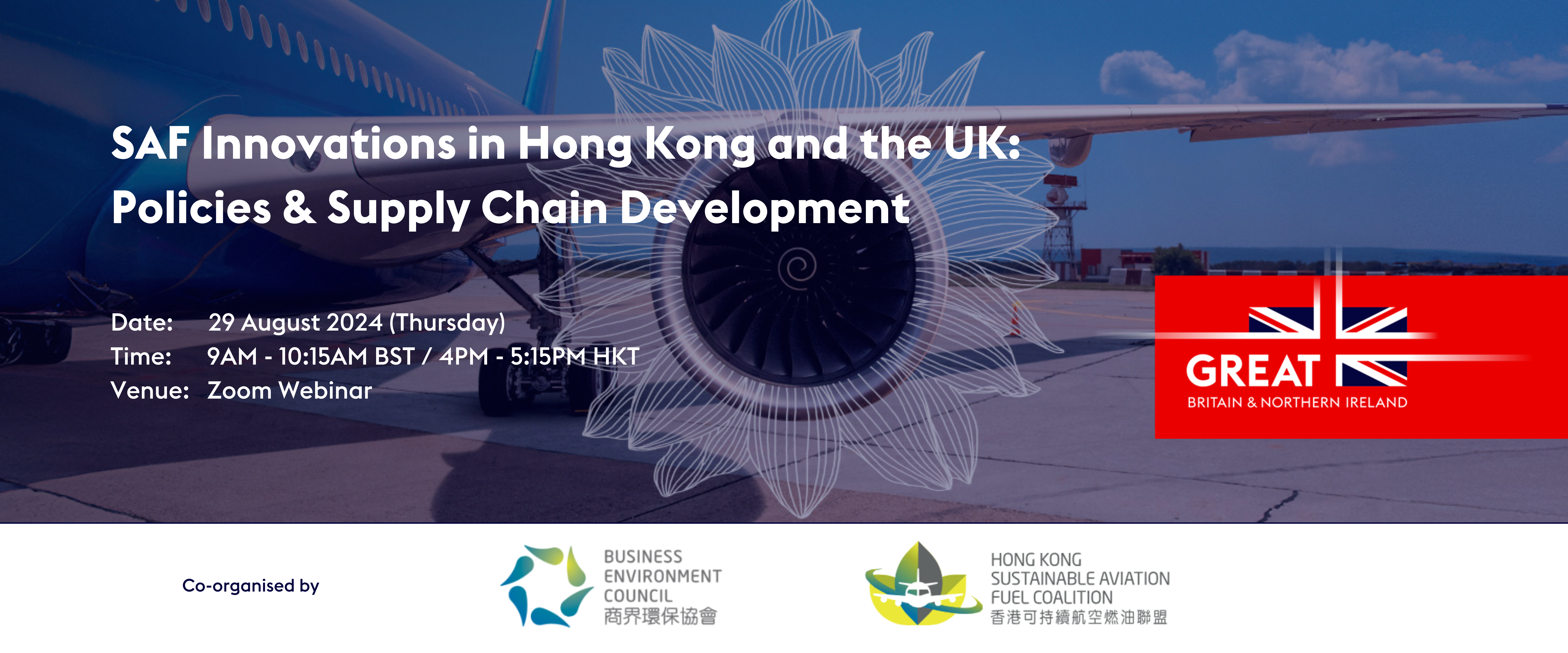 Co-organised with British Consulate-General Hong Kong, , this insightful webinar discovered the pioneering efforts of stakeholders in Hong Kong and the United Kingdom in upscaling Sustainable Aviation Fuel (SAF) development within their jurisdictions and globally. Participants explored the innovative strategies, initiatives, and partnerships driving the adoption of SAF in these regions and uncovered the potential for collaboration between Hong Kong and the UK to mutually benefit stakeholders and propel sustainable aviation practices worldwide. Topics of discussion included the newly announced UK SAF mandate, global SAF production, the book and claim platform for SAF, and international collaboration opportunities. Attendees did not miss this webinar to learn from experts in the aviation industry and delve into the future of sustainable aviation and the transformative impact of SAF advancements.