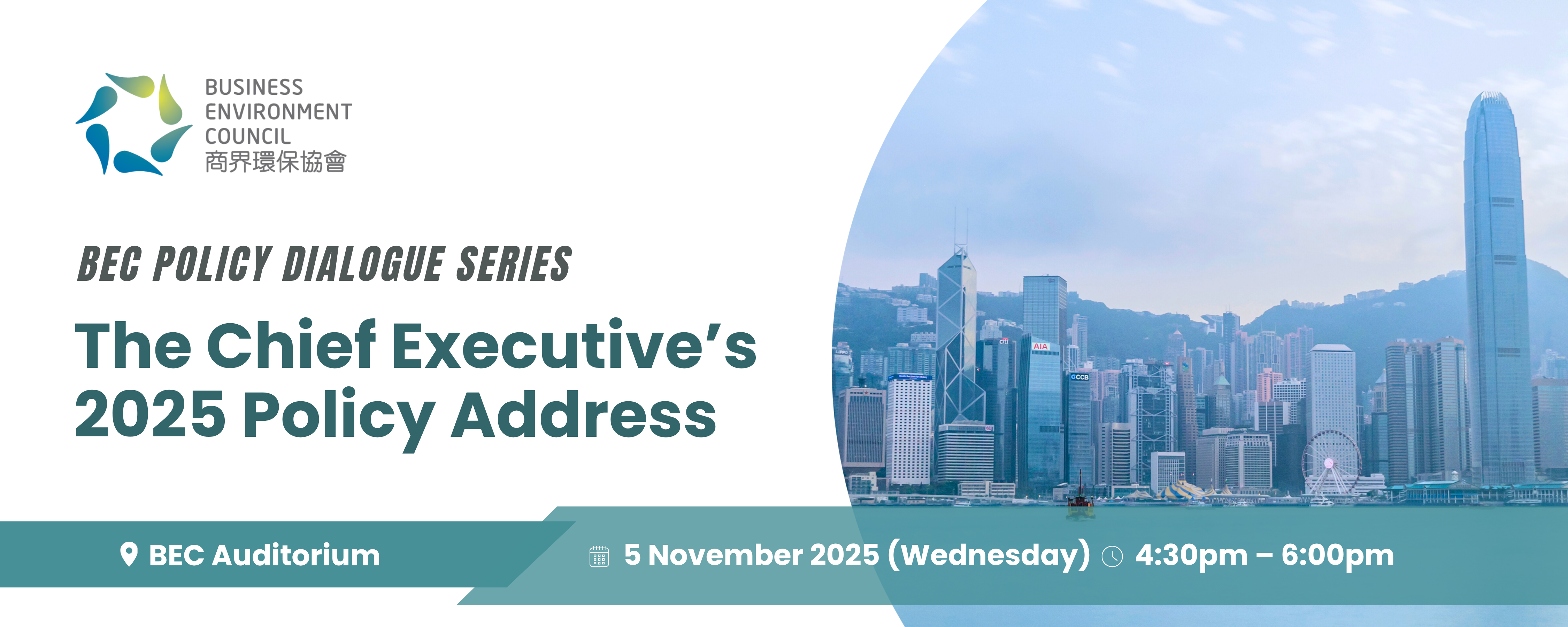 Following the release of the Chief Executive’s 2025 Policy Address, BEC will be hosting a dialogue session for members to exchange opinions with the Government. This dialogue session strives to share the Government's latest thoughts and goals related to climate and environment, and allows business to address significant issues and concerns such as sectoral decarbonisation, financing transition, climate-related data disclosure, resilience, and adaptation. By assembling various and diverse viewpoints, we hope to foster an in-depth conversation with the Government on transitioning to a net-zero economy that incorporates the expectations of the business sector.