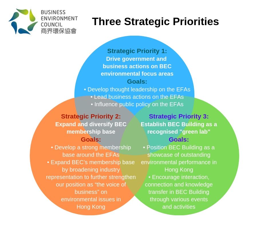 The goal of this strategic plan is to make BEC’s work more focused and impactful while simultaneously growing our membership base and strengthening the BEC brand in Hong Kong. We believe this strategic plan is a significant step leading to stronger appreciation of BEC’s work and increased recognition of BEC name and brand. I would like to thank all our Board Members and the Senior Management Team for their hard work and support in developing this roadmap. The successful execution of this strategic plan will rest on the collective efforts of the entire organisation and the continued support from you.
