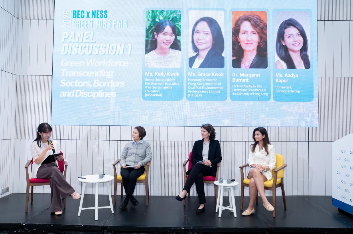 BEC x NESS Green Jobs Fair 2026 brought together companies, universities, students, and government officials for a comprehensive discussion aimed at addressing the current knowledge and skill gap in the Hong Kong green jobs market. Filled with panel discussions, technical workshops, green job booths, and multi-stakeholder dialogue, the one-day event connects youth with potential employers for prospective green jobs and sustainability programmes, and to gain insights on the required skill set and knowledge to enter the green jobs market.