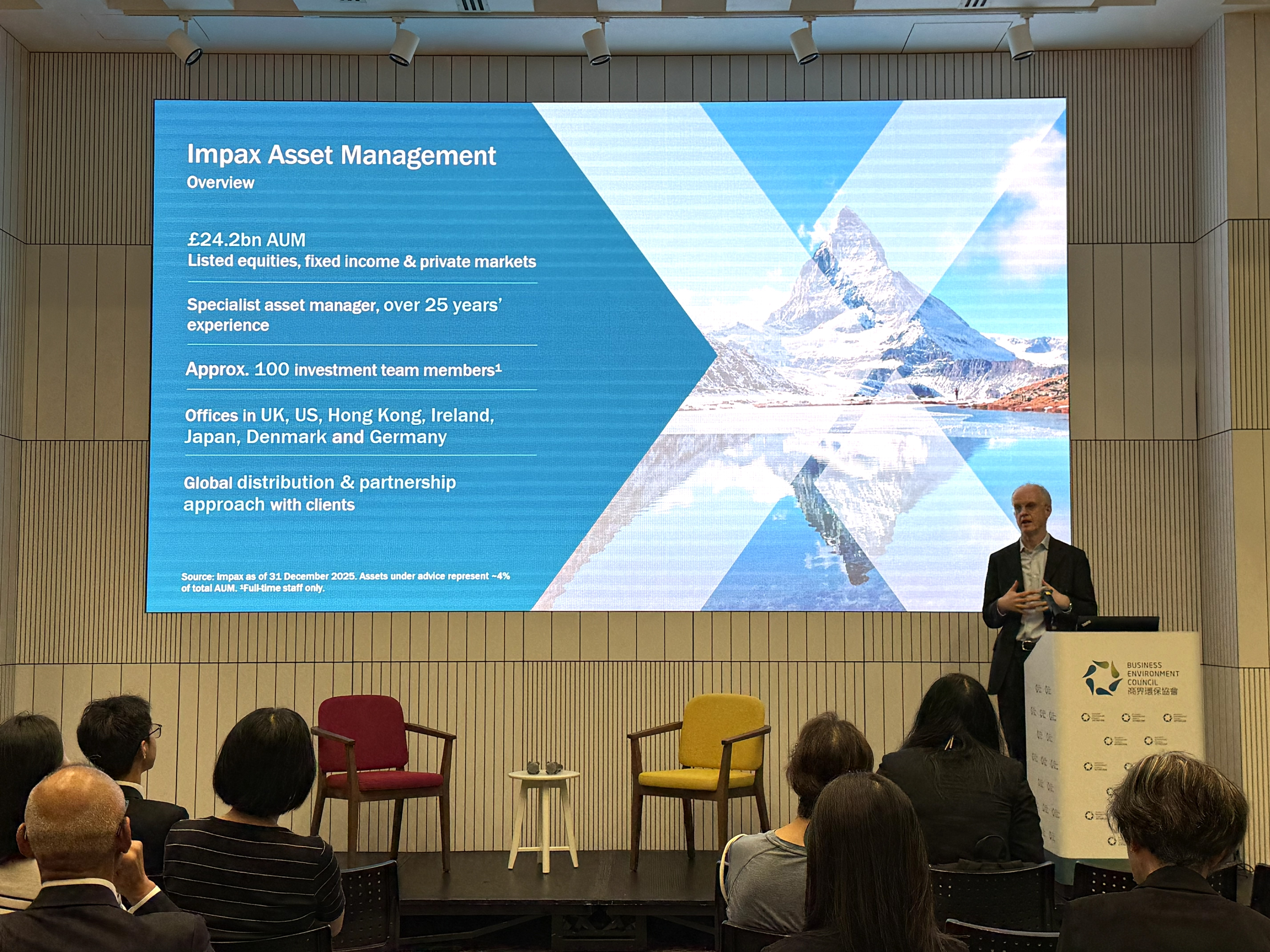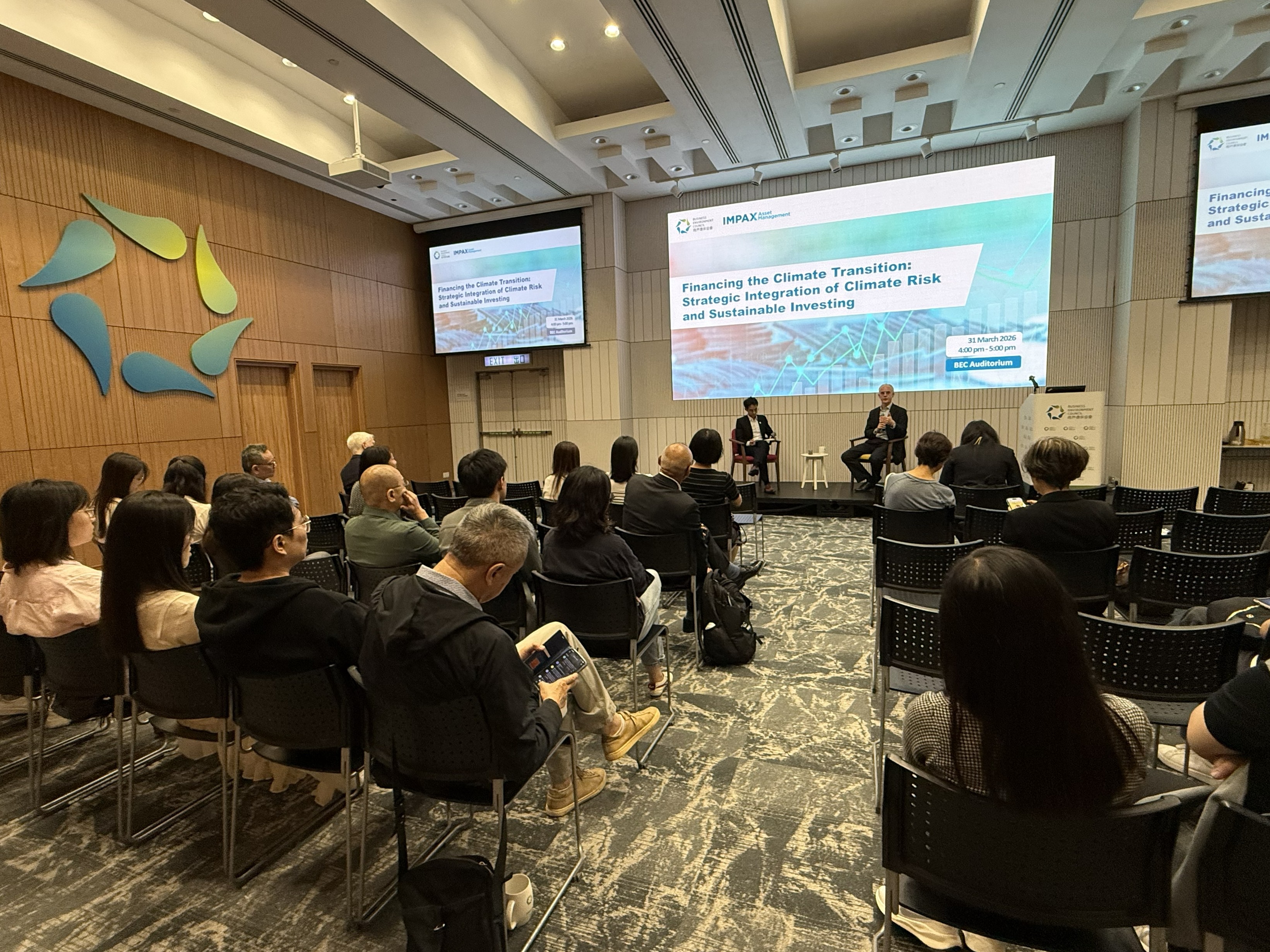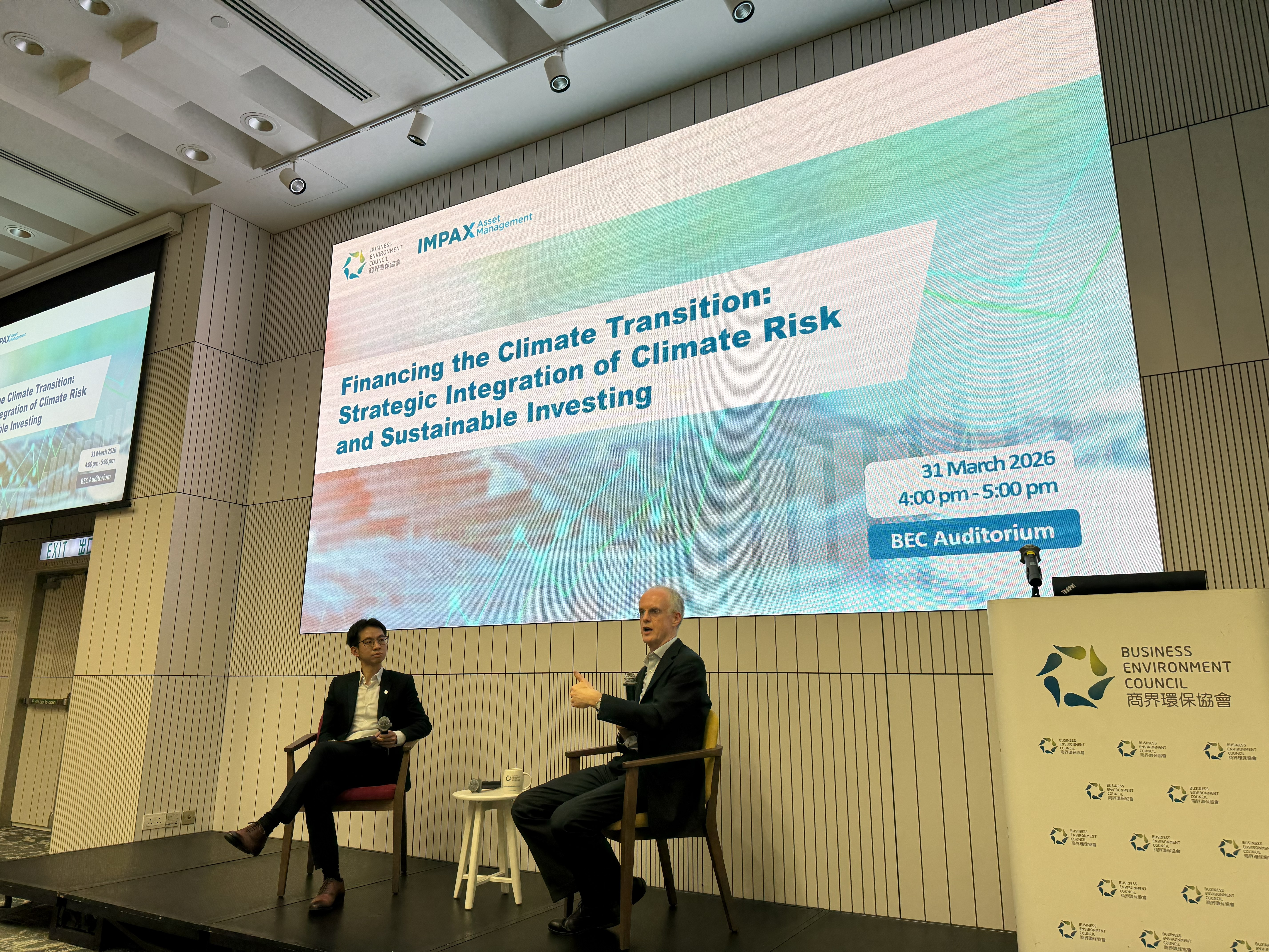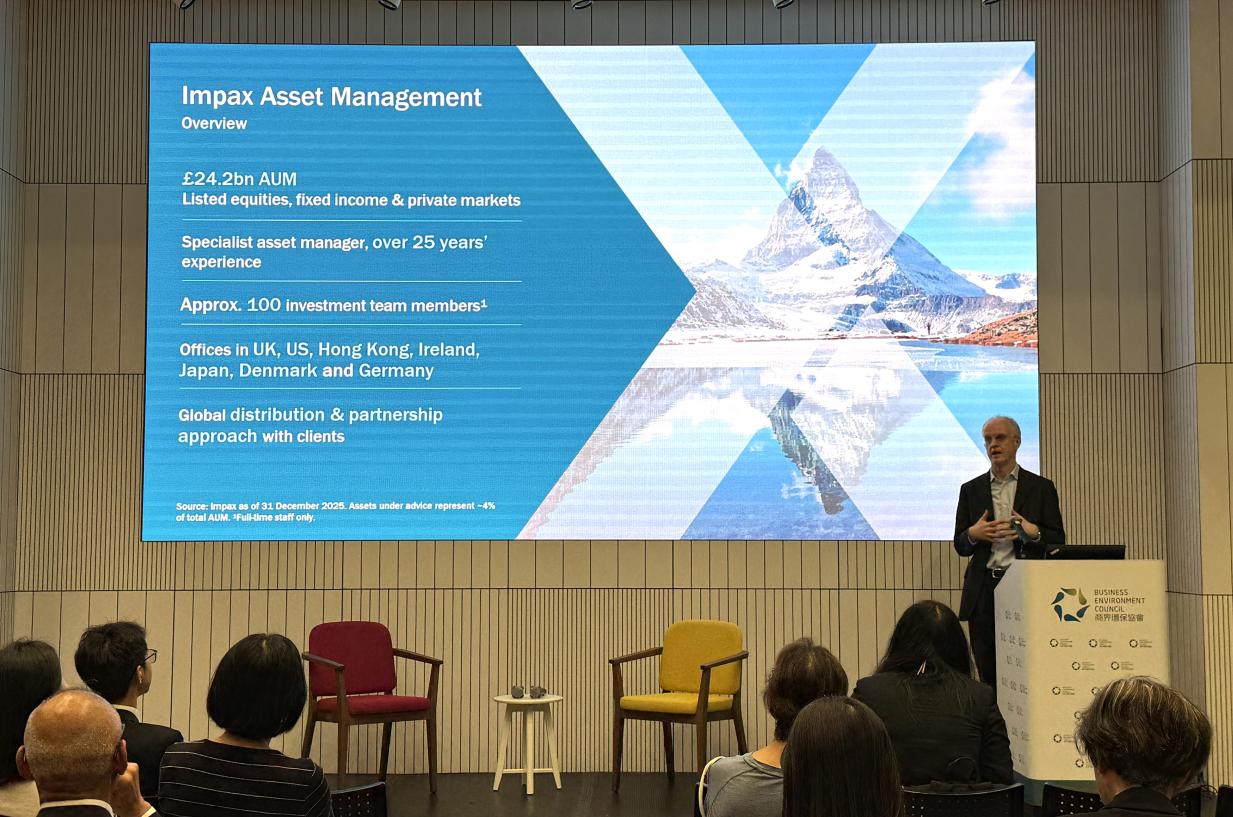 We were honoured to host Mr Ian Simm, Founder and Chief Executive of Impax Asset Management. Drawing from his extensive experience advising the UK government and leading a US$35 billion global asset management firm specialised on environmental markets and sustainable transition, Ian delivered a brief presentation on his investment philosophy and recent sustainability policy developments in Europe. Following the presentation, our host, Mr Merlin Lao, Head – Policy & Research, Business Environment Council, joined Ian for an insightful fireside chat. Together, they explored how to navigate market uncertainties, drive climate transition, and build adaptation and resilience within the Hong Kong and China markets.