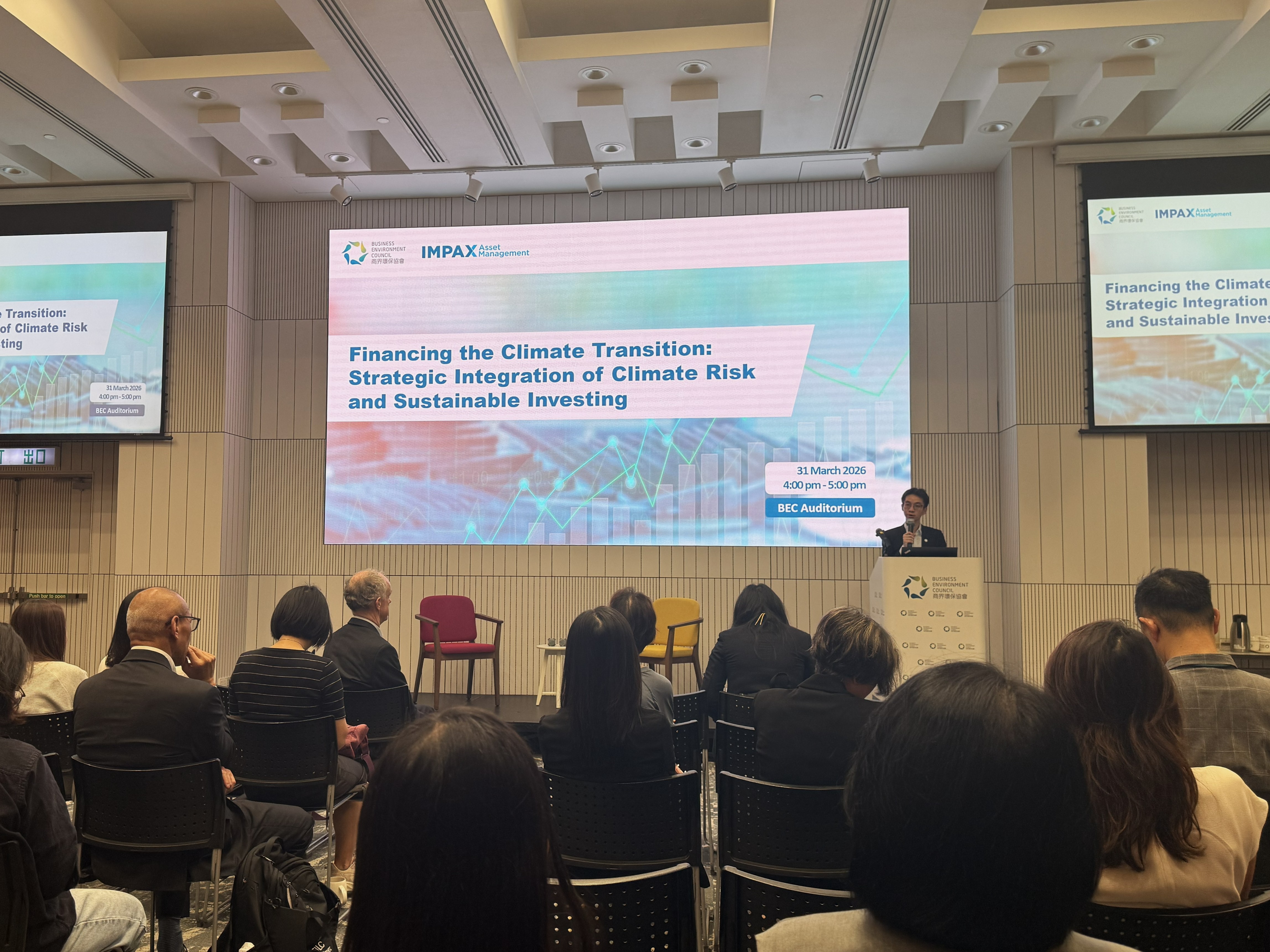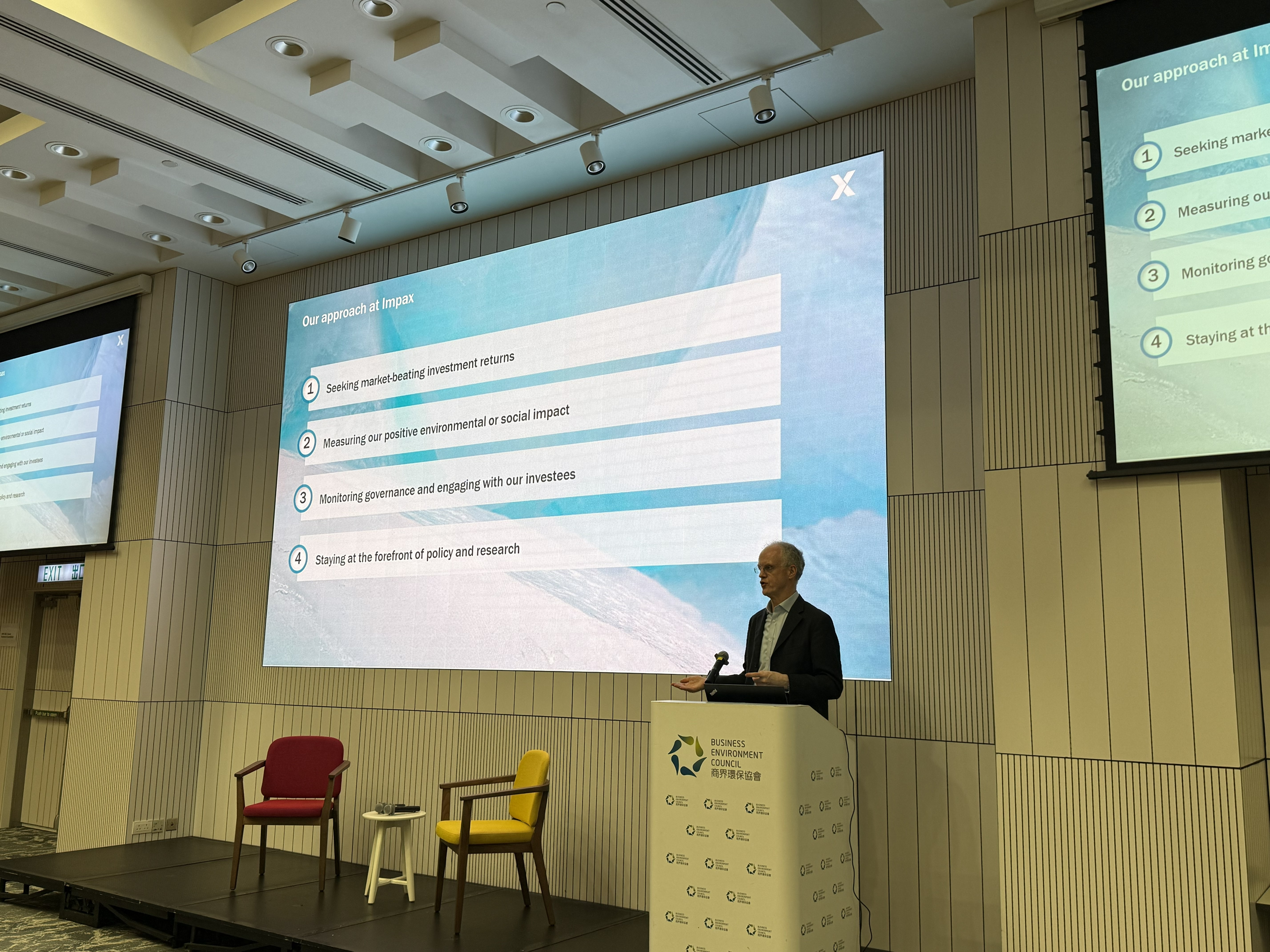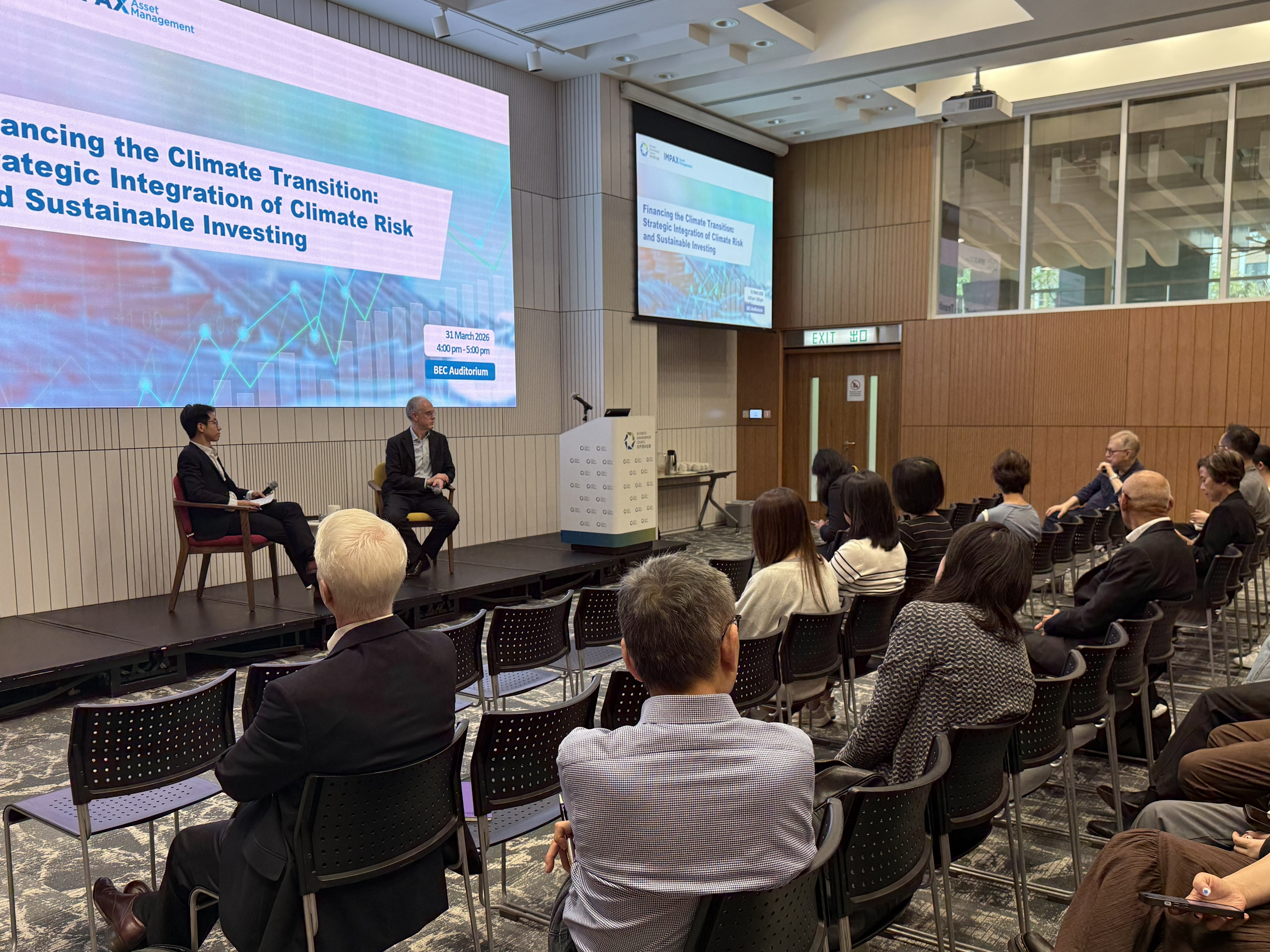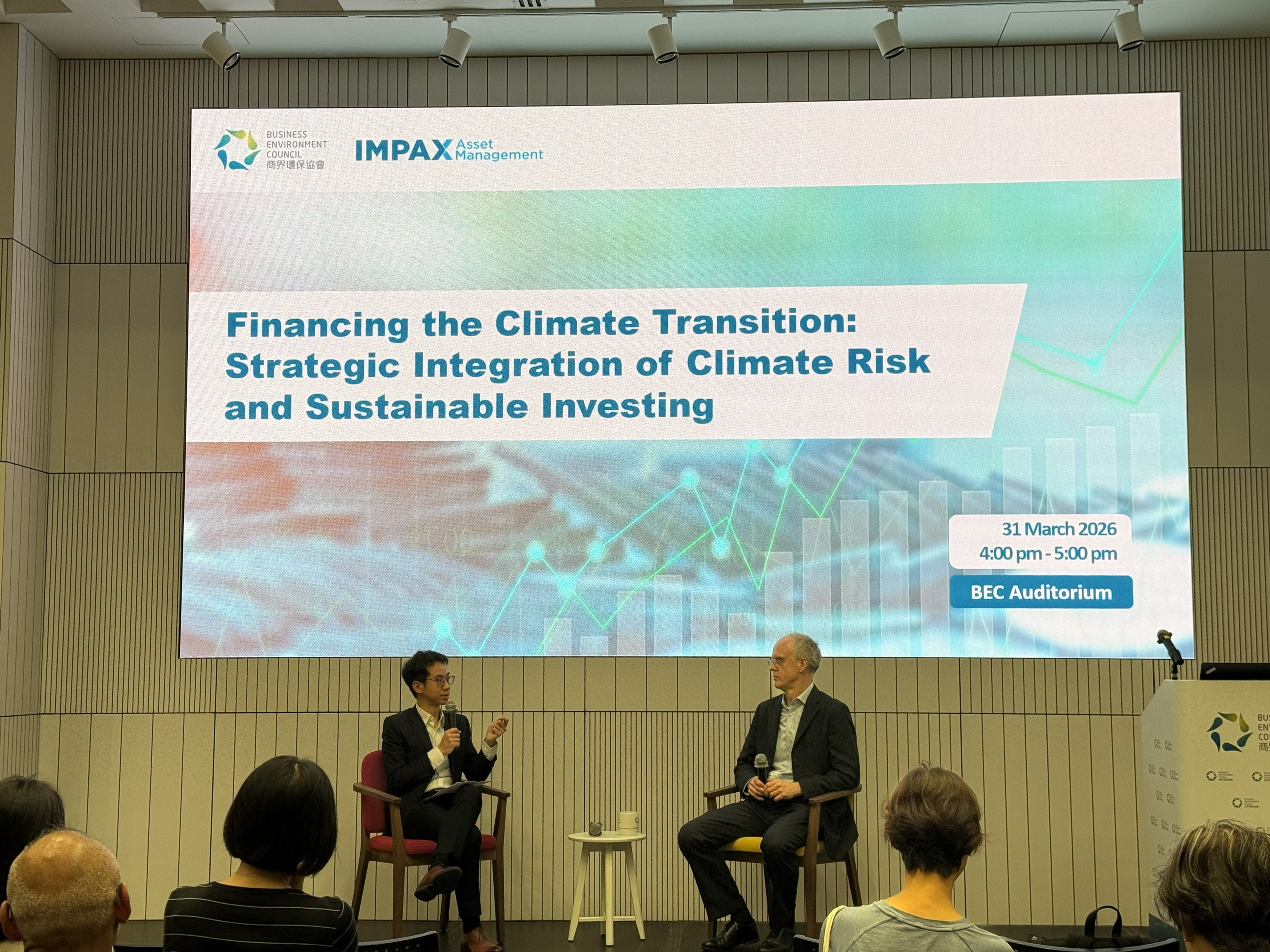 We were honoured to host Mr Ian Simm, Founder and Chief Executive of Impax Asset Management. Drawing from his extensive experience advising the UK government and leading a US$35 billion global asset management firm specialised on environmental markets and sustainable transition, Ian delivered a brief presentation on his investment philosophy and recent sustainability policy developments in Europe. Following the presentation, our host, Mr Merlin Lao, Head – Policy & Research, Business Environment Council, joined Ian for an insightful fireside chat. Together, they explored how to navigate market uncertainties, drive climate transition, and build adaptation and resilience within the Hong Kong and China markets.